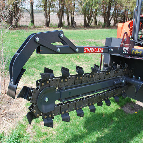 แบรดโก® 625 Trenchers มีบูมยาวคงที่พร้อมสปริงโหลด ลูกกลิ้งปรับระดับได้เองพร้อมตัวป้องกันหินเต็มตัว